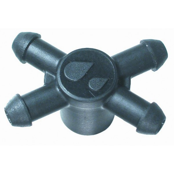 Četverosmjerni razdjelnik koji se postavlja na dio za kapanje kapajuće gljive. Lako mu se mogu priključiti četiri špageti crijeva bilo koje duljine, čime ravnomjerno možemo raspodijeliti količinu vode na više smjerova.