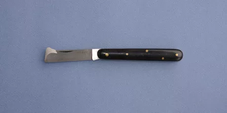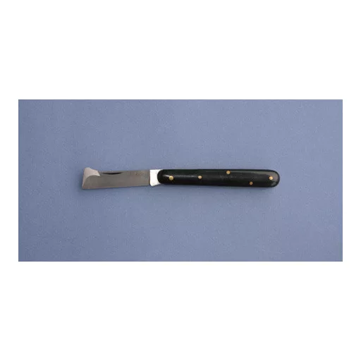Mali nož za cijepljenje s plastičnom drškom. Duljina: 9,5 cm Težina: 45 g Oštrica: sklopiva, ugljični čelik Debljina oštrice: 2 mm Drška: ovalna, plastična Uložak: bakar