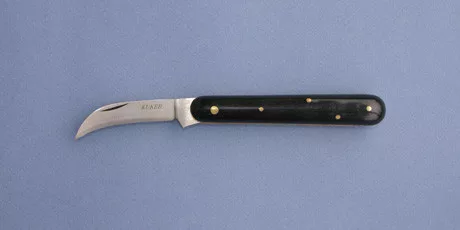 Zakrivljen nož za cijepljenje s uskim sječivom i debelom plastičnom drškom.