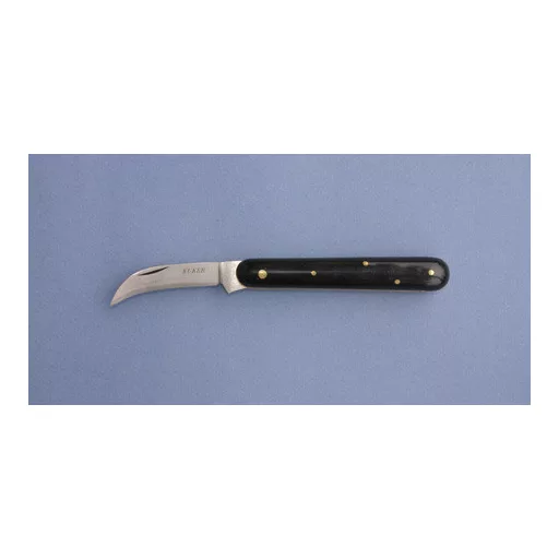 Zakrivljeni, uskog sječiva nož s debelom plastičnom drškom. Duljina: 10,5 cm Težina: 65 g Oštrica: sklopiva, ugljični čelik Debljina oštrice: 2 mm Drška: okrugla, plastična Uložak: bronca