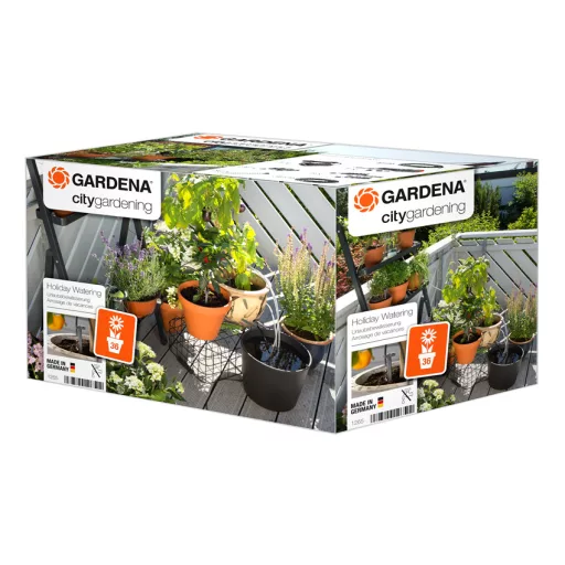 S GARDENA automatskom kanom za zalijevanje moguće je automatski zalijevati do 36 biljaka u saksijama. Udobno možete zalijevati biljke bez nošenja kante za zalijevanje, a posebno je korisno kad putujete. Zalijevanje aktivira transformator s ugrađenim tajmerom na 1 minutu dnevno. Kroz tri različita raspodjelnika kapljica količinu izlazne vode moguće je prilagoditi potrebama biljaka — od 15 ml/min preko 30 ml/min do maksimalno 60 ml/min. Za biljke koje zahtijevaju puno vode u saksiju možete postaviti i do 3 raspodjelnika kapljica. Niskonaponski transformator sa zaštitnim poklopcem prikladan je za unutarnju i vanjsku upotrebu. Sadržaj kompleta: transformator s tajmerom (14 V), pumpa s filtrom za nečistoće, 3 raspodjelnika kapljica sa po 12 izlaza, 9 m razdjelne cijevi, 30 m kapljične cijevi, 36 šiljaka za učvršćivanje cijevi, 20 zatvornih čepova.