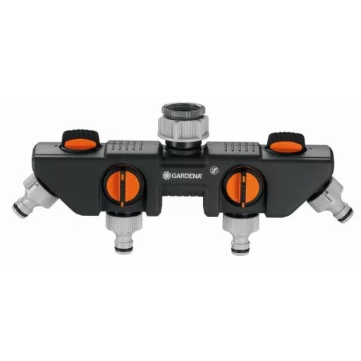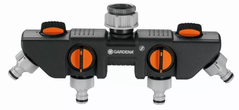 Uz GARDENA 4‑putni razdjelnik istovremeno se na jednu slavinu može priključiti više uređaja. Protok vode na svakom izlazu može se zasebno regulirati ili zaustaviti. Na 4‑putni razdjelnik mogu se priključiti dva GARDENA računala za navodnjavanje ili tajmera za navodnjavanje. 4‑putni razdjelnik može se preinaciti na GARDENA Profi sustav pomoću Profi nastavka za slavinu (šifra: 2801-20). Može se koristiti sa slavinama navoja 33,3 mm (G 1") i 26,5 mm (G 3/4").