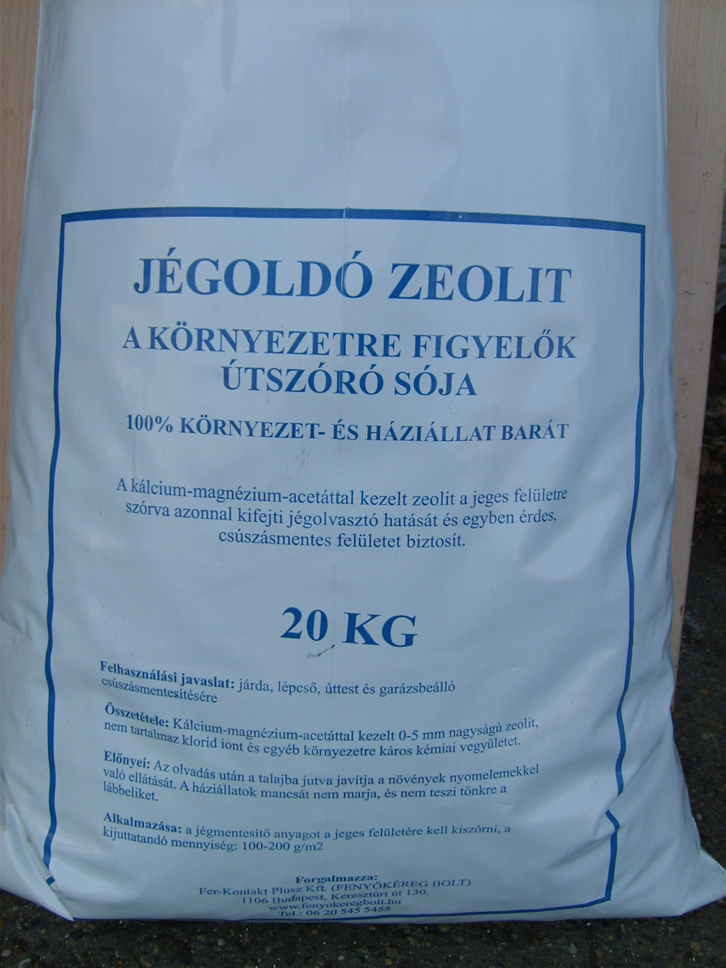 Zeolit tretiran acetatom kalcija-magnija (CMA), veličine 0-5 mm, ne sadrži kloridne ione niti druge kemijske spojeve štetne za okoliš. Može otapati led do -15 °C. Prijateljski je prema okolišu i kućnim ljubimcima. U zapadnoj Europi (npr. Austrija, skandinavske zemlje) više od dva desetljeća koriste zeolit tretiran acetatom kalcija-magnija za otapanje leda na kolnicima. Iskustva pokazuju da je to korisno ne samo zbog izvrsnog djelovanja protiv leda, već i zato što veže dio lebdeće prašine; osobito čestice nastale trošenjem guma i kočionih pločica koje vozila podižu u zrak. Time se znatno smanjuje i zagađenje zraka. Materijali koji sadrže klorid izazivaju koroziju i uništavaju vegetaciju. Razgrađuju se vrlo sporo, što također povećava njihove štetne učinke. Stoga je važno zamijeniti cestovnu sol (natrijev klorid) nekim sredstvom za odleđivanje koje ne sadrži kloridne ione. Odlične alternative mogu biti acetati, koji su posve bezopasni i 100% ekološki prihvatljivi minerali. Koriste se i u zdravstvu te u prehrambenoj industriji. Acetat kalcija (E263) (poznat i kao kalcij-etanoat) sol je octene kiseline (E260) s kalcijem. U prehrambenoj industriji uglavnom se koristi za konzerviranje pekarskih proizvoda i regulaciju kiselosti, a u zdravstvu se primjenjuje kod povišene razine fosfata u krvi. Prirodno se nalazi u gotovo svim fermentiranim namirnicama. Acetat magnezija je sol octene kiseline i magnezija. Zeolit za odleđivanje može se koristiti za odleđivanje pločnika, stepenica, kolnika, garažnih mjesta i parkirališta. Preporučena doza je 100–200 g/m2, koja se posipa po zaleđenoj ili snježnoj površini i odmah djeluje na otapanje leda, istovremeno osiguravajući hrapavu, neklizajuću površinu. Tijekom snježnih padalina djelomično pretvara pali snijeg u vodu, čime štedi vrijeme i energiju potrebne za uklanjanje snijega.