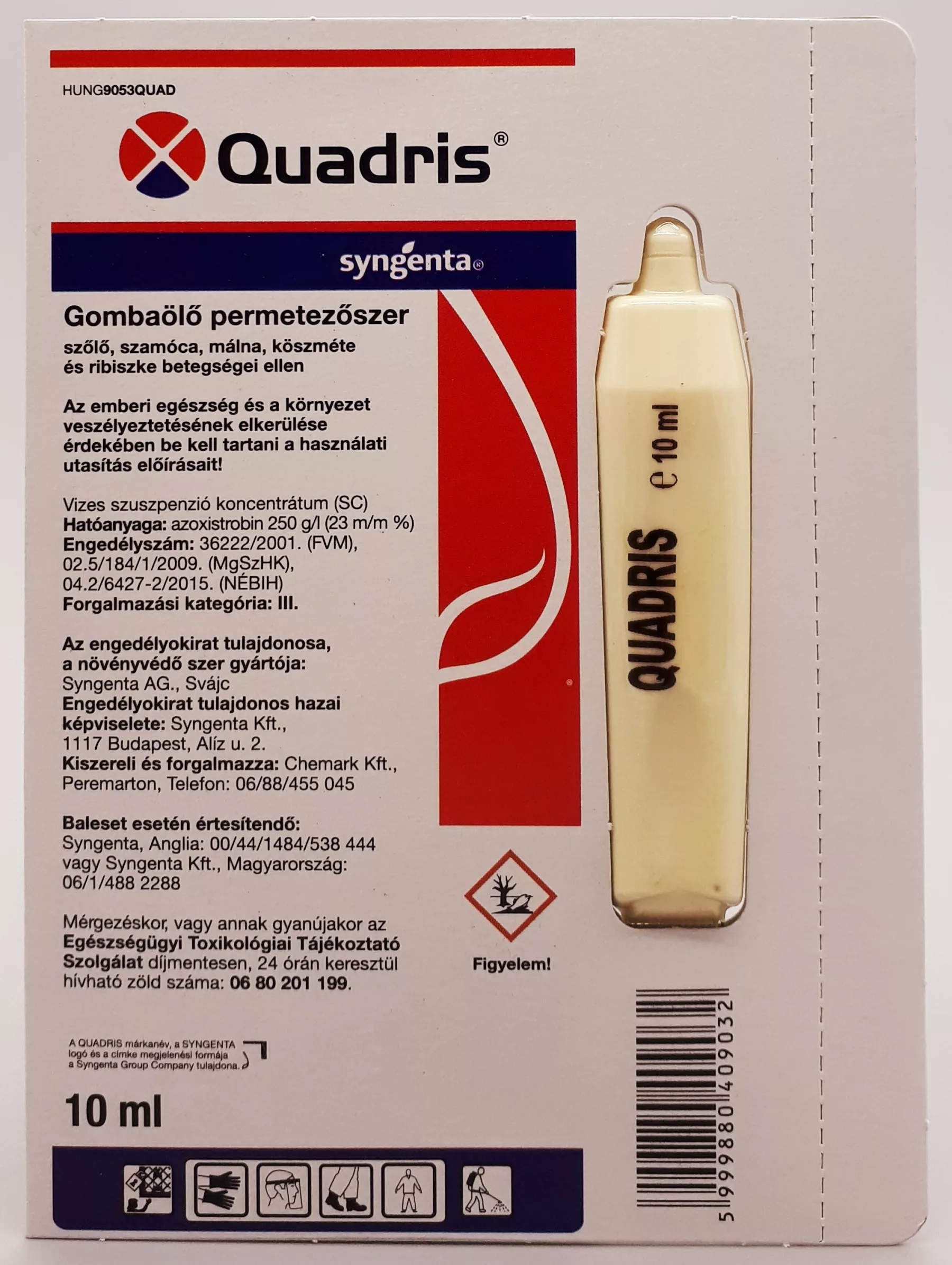 Ukupno izvedite 2–3 tretmana Quadrisom. Nakon drugog prskanja Quadrisom ponovno preporučujemo kontaktna sredstva: pri zatvaranju grozda Chorus, a pri početku zrenja bakar + Thiovit Jet.