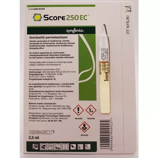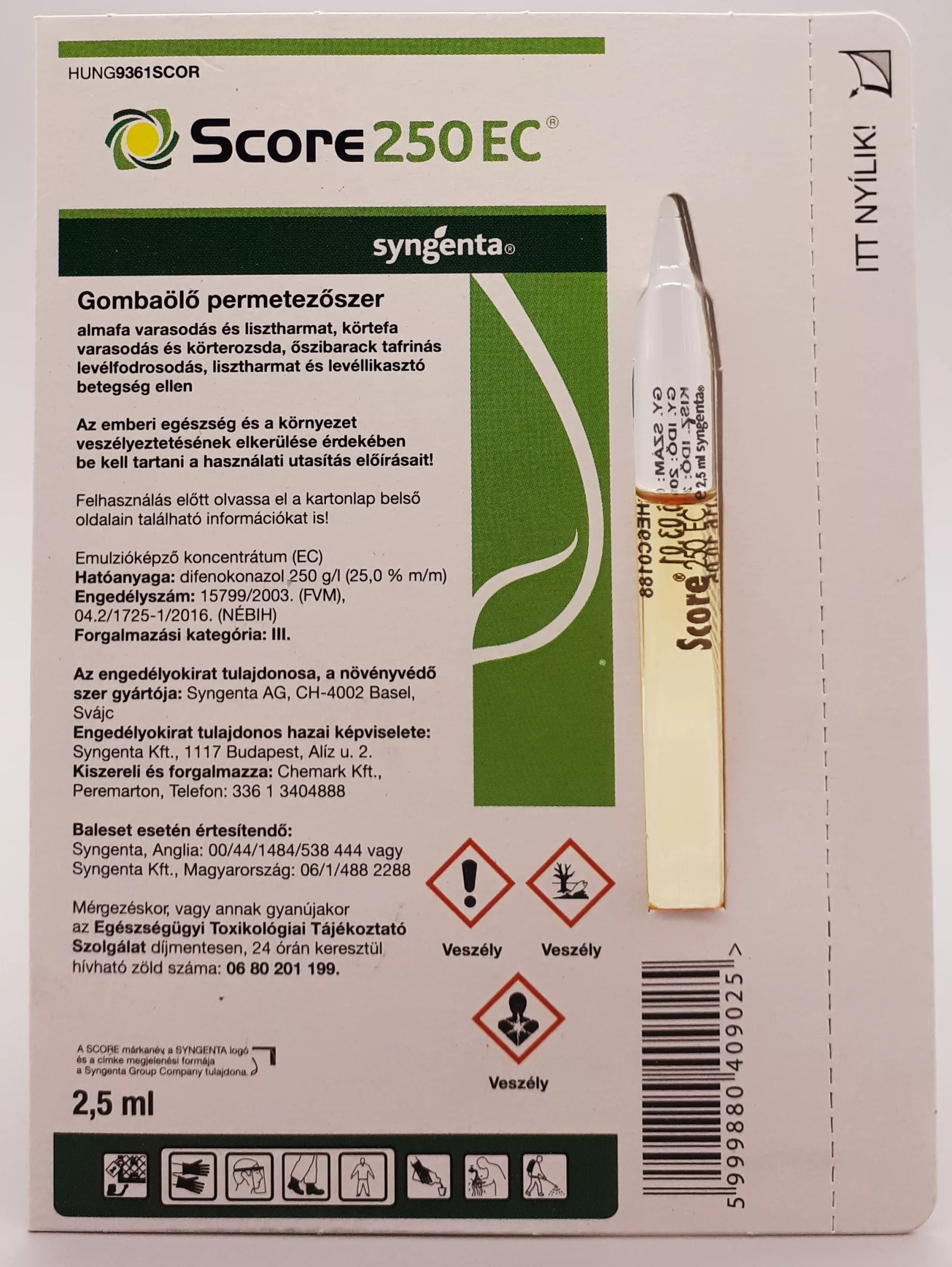 Protiv krastavosti i pepelnice primjena 0,2–0,25 l/ha. Score preporučujemo u najosjetljivijoj fazi rasta jabuke za suzbijanje krastavosti (Venturia). Jedinstvena je osobina Scorea da, primijenjen unutar 96 sati (4 dana) od početka padalina, može zaustaviti infekciju krastavosti i spriječiti pojavu simptoma. Score se preporučuje za zaštitu jabuke od opadanja latica, u blokovima, svaka 8–10 dana. Score se nakon prskanja brzo upija i pruža zaštitu i tijekom intenzivnog razdoblja rasta. Prije tretmana Scoreom preporučuje se primjena Chorusa od stanja „miševo uho“ (egérfüles).