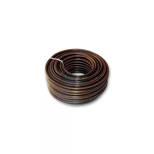 Troslojno crijevo s tkaninskim uloškom. I sloj: crni PVC, otporan na UV i alge. II sloj: mrežasta pletenica od sintetičkih vlakana. III sloj: crni mekani PVC s dvije narančaste pruge. Bez uvijanja.