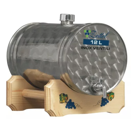 Predstavljanje ležećeg spremnika na drvenom stalku, od inoxa, sa slavinom: