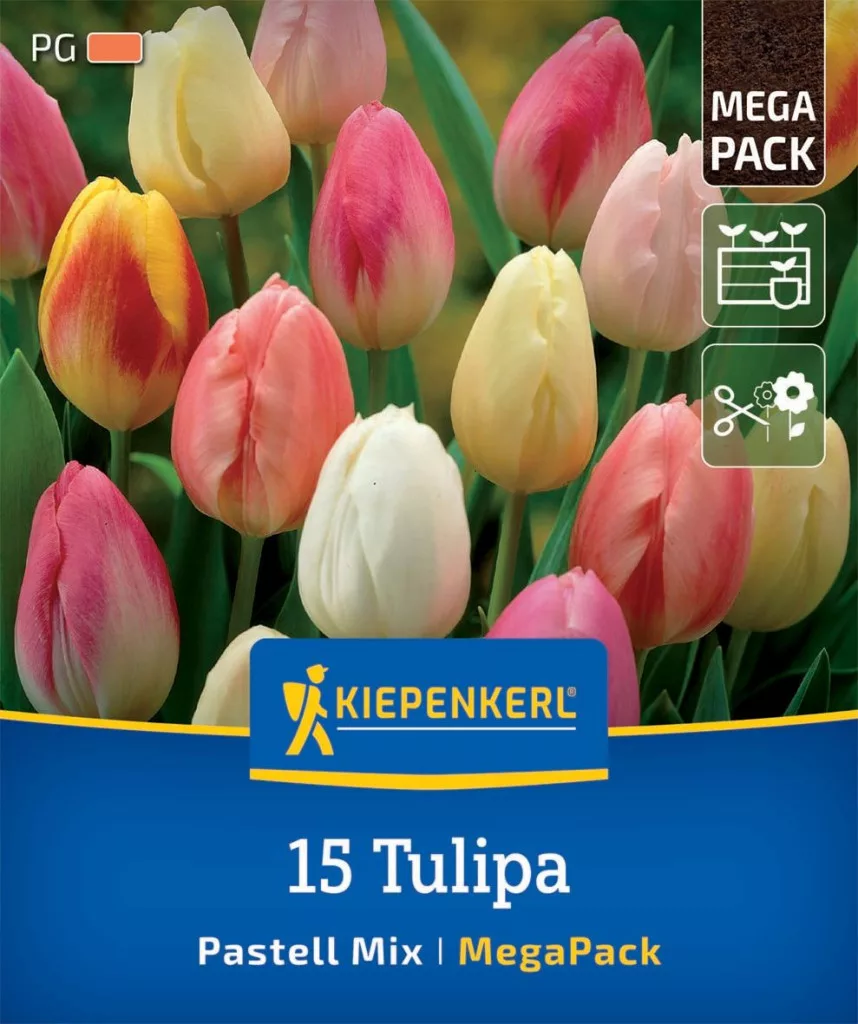 Kiepenkerl Tulipan Pastell Mix Megapack 15 kom praktičan je izbor za sve koji žele jednostavno održivu i efektno izgledajuću proljetnu cvjetnu dekoraciju u vrtu, s umjerenom i elegantnom paletom boja.