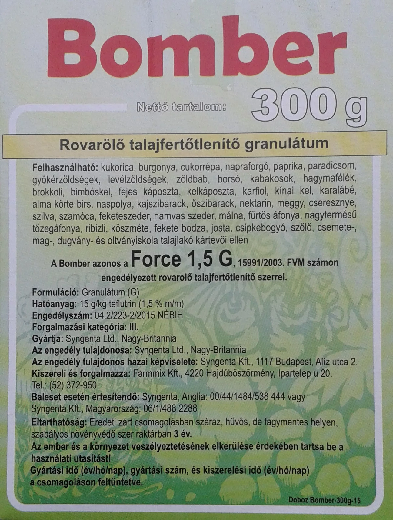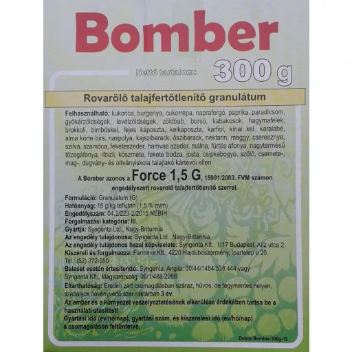 Nakon dezinfekcije tla Bombrom 1,5 granulata moguće je bez opasnosti od fitotoksičnosti koristiti herbicide sa sulfonilurea aktivnom tvari – npr. Milagro. Aktivna tvar: 15 g/kg teflutrin
