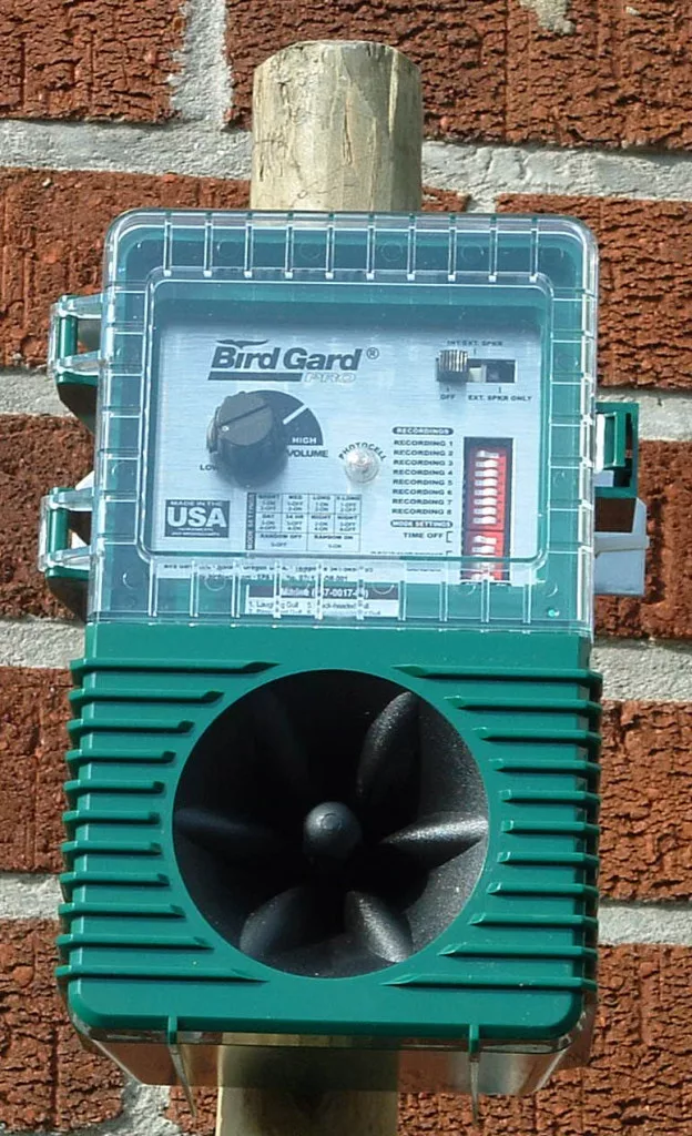 A Bird Gard Pro električni akustični uređaj za odganu ptica. Pomoću uređaja učinkovito možete otjerati neželjene golubove, čvorke i druge ptice. Uređaj se može koristiti na gospodarstvima, industrijskim područjima, u skladištima, na prostoru trgovina te u lukama za zaštitu brodova, čamaca i jahti. Bird Gard je profesionalni uređaj za odbijanje ptica koji je zahvaljujući vodootpornom vanjskom kućištu otporan na vremenske uvjete. Uređaj plaši i stvara pritisak na ptice u okolini digitaliziranim, realističnim reprodukcijama različitih alarmnih i uzbunjivačkih zvukova ptica. Na Bird Gard Pro uređaju moguće je postaviti osam različitih ptičjih zvukova i raznoliku reprodukciju pri odabranoj glasnoći. Uređaj je opremljen sumrak-prekidačem, a razdoblje reprodukcije (dan, noć, cijeli dan) može se jednostavno postaviti. Također je moguće podesiti trajanje reprodukcija i čak nasumičnu reprodukciju izvan redoslijeda radi veće učinkovitosti.