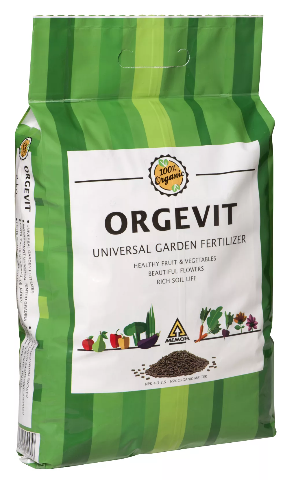 ORGEVIT je visokokvalitetno organsko gnojivo u granulama veličine 4–5 mm, u modernom pakiranju. Posebno pogodno za vrtlarstvo i otvoreno poljoprivredno uzgojavanje, kao i za gnojidbu voćnjaka, vinograda i ukrasnih biljaka. Proizvod je izrađen od 100% peradskog gnoja. Kao prirodni izvor sadrži makro- i mikroelemente potrebne biljkama. Zbog toplinske obrade ne spaljuje korijen. Proizvod sadrži visok udio organske tvari koja pomaže spriječiti degradaciju tla, olakšava unos hranjiva biljkama, poboljšava strukturu tla, povećava zadržavanje vode i smanjuje ispiranje. Doze primjene: ORGEVIT 4 - 2,5 - 2,3 Za proizvodnju povrća u foliji: 25–60 kg/100 m2 Za otvoreno polje: 1–3 t/ha Voćke: 1,5–3 t/ha Jagode: 1–1,5 t/ha Vinogradi: 1,2–1,8 t/ha Ukrasno bilje: 30–60 kg/100 m2 Za rasadnike: 1,5 t/ha Informacije: - bogat mikroelementima: Fe, Mn, B, Zn, Cu - bez štetnih kemijskih tvari - niska količina klora Dio organske tvari ne raspada se u potpunosti ni nakon jedne godine, stoga ostaje u tlu i dalje. Primjena: strojnim rasipanjem ili ručno po površini tla. Prije sadnje ili sjetve ORGEVIT treba duboko unijeti u tlo, a zatim obilno zaliti. Može se primijeniti i prilikom sadnje u drenažni rov, koji treba biti 15–20 cm udaljen od korijena biljke. Upotreba: Kupusnjače: nekoliko dana prije sadnje, pri pripremi tla u jednom prolazu. Prije rotacije treba ravnomjerno rasuti po površini tla. Preporučena doza za kupusnjače ovisi o hranjivom stanju tla: 15–25 kg/100 m2. Na pjeskovitim tlima preporučuje se veća doza. Duboka obrada treba biti plitka jer je korijenje u gornjem sloju tla. Paprika, rajčica: među intenzivnijim kulturama, u slučaju paprike i rajčice proizvod treba rasuti ispod redova ili dvorednih sustava. Primijenjena doza ovisi o opskrbljenosti tla hranjivima, ali približno iznosi 20–40 kg/100 m2. Ne spaljuje korijen biljke, no iz opreza nemojte saditi neposredno na gnojivo. ORGEVIT se dobro otapa u vodi i odmah je dostupan biljci. Lubenica, krastavac: tikvice i ostale tikvarke također su zahtjevne prema hranjivima, stoga je preporučena doza 25–40 kg/100 m2. Na labavijim tlima preporučuje se veća doza. Krumpir: ovisno o načinu proizvodnje, primijenjena doza 2–2,5 t/ha, pri čemu treba uvijek uzeti u obzir hranjivost tla. Korijen krumpira ne prodire duboko, stoga se obrađuje plitko ispod brazde. Vinova loza: preporučena količina 1,2–1,8 t/ha, ovisno o vrsti tla. Na pjeskovitim tlima preporučuje se 1,5 t/ha, a na humusnim i mineralima bogatim tlima 1,2 t/ha. Primjena treba biti u proljeće, što bliže korijenju, obrađujući na dubinu 10–20 cm. Voćnjaci: posebno preporučujemo za gnojidbu koštunjavih kultura; pri intenzivnim uvjetima i visokim prinosima 2–2,4 t/ha. Za nadopunu hranjiva i održavanje razine 1,2 t/ha. Primjena u proljeće ili kasnu jesen. Jagode: doza 30–50 kg/100 m2 daje izvrsne prinose, veće plodove te ravnomjernije cvjetanje i dozrijevanje. Primjena: rasuti pri pripremi tla i unijeti na dubinu 5–10 cm. pH vrijednost: 7 Sastav: organska tvar 65%, suha tvar 90%, dušik 4,0%, fosfor (P2O5) 2,5%, kalij (K2O) 2,3%, magnezij (MgO) 1,1%, kalcij (CaO) 9,3%
