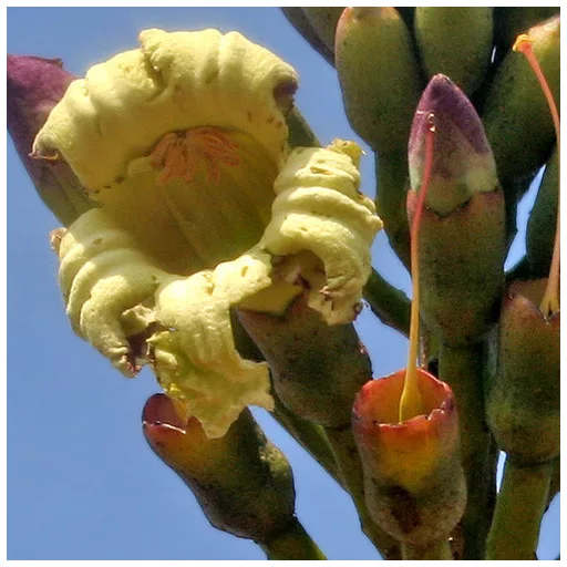 Sama biljka nalikuje srednje velikom drvetu, cvjetovi joj otvaraju noću i mogu biti žuti ili crveni, a oprašuju je šišmiši. Cvatu slijedi ogroman zakrivljeni mahunar dužine 50–60 cm koji visi s grana i izgleda poput mača ili srpa. Kad padnu s drveta i uvenu, izgledaju kao da su oko stabla razbacane slomljene kosti. Po tom jezivom izgledu dobila je i engleski naziv.