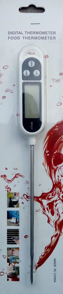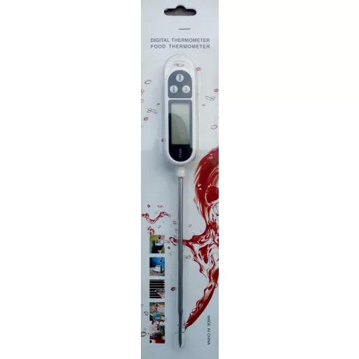 Digitalni termometar. Mjerni raspon od -50°C do +300°C Točnost mjerenja 0,1°C Dopuštena pogreška ±1°C Pogodan za mjerenje temperature hladnih i vrućih tekućina te čvrstih tvari.