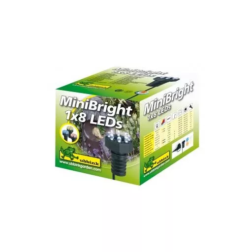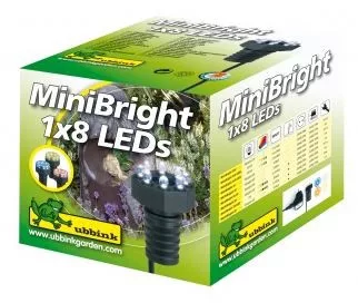 Rasvjeta MiniBright 1x8 LED Mini Bright 1*8 LED svjetiljka za ribnjake, namijenjena isključivo za uporabu u vodi. Izvrsna za osvjetljavanje fontana i vodopada. Snaga je 0,6 W. Radi na niskonaponskom 12 V sustavu. Kabel duljine 5 m koji pripada LED svjetiljci omogućuje fleksibilno postavljanje. Korištenjem priloženih filtera boja (crvena, žuta, plava) možete postići različite kolorističke efekte. Transformator potreban za rad svjetiljke za ribnjak uključen je u paket. Prednosti LED rasvjetnog sustava: S LED svjetiljkama iz ove serije koje rade na niskom naponu od 12 V ušteda energije iznosi 90%, a vijek trajanja je znatno veći — najmanje 30.000 sati u usporedbi s tradicionalnim 220 V žaruljama. Instalacija sustava je izuzetno jednostavna. Svaka je svjetiljka opremljena kabelom s gumenom izolacijom. Svjetiljke se jednostavno mogu, bez posebnog stručnog znanja, priključiti na razdjelnike i transformatore koji su dio sustava. Svi dijelovi sustava — priključci, transformatori — potpuno su vodootporni.