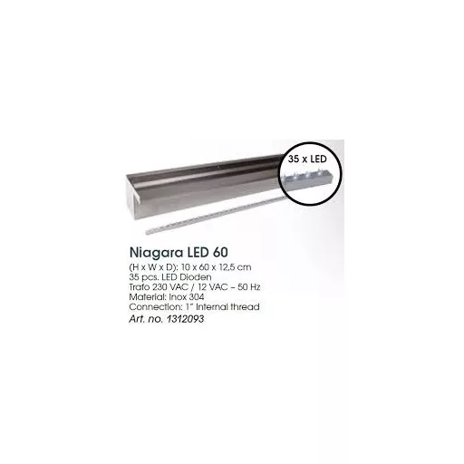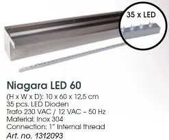 60 cm širok 10 x 60 x 12,5 cm (d x š x v) Materijal: nehrđajući čelik Priključak: 1" sa 35 LED žarulja Oprema je prilično lagana, s podesivim pričvršćivačima. Preporučena pumpa: 10.000 - 18.000 l/h Moderan element vodopada, s velikim protokom vode. Radi...