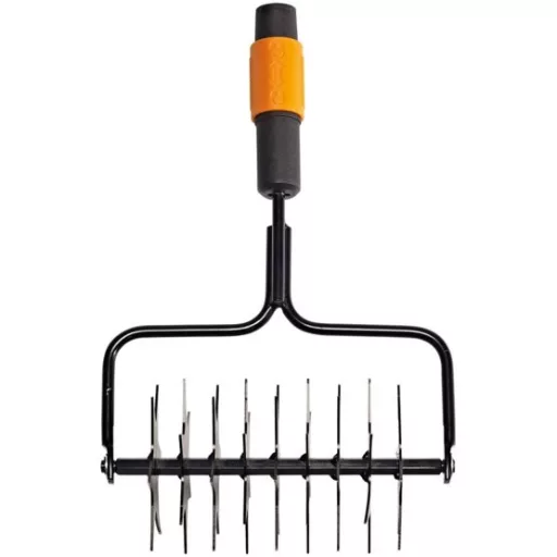 Za zračenje manjeg travnjaka Pomoću njega hranjive tvari, gnojivo, sjemenke, voda i zrak mogu ući u tlo i lakše dosegnuti korijen trave Ojačana glava od nehrđajućeg čelika Preporučena drška: QuikFit™ drška (L)