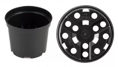 Dostupna pojedinačno, crne boje plastična saksija, za uzgoj srednjih biljaka.