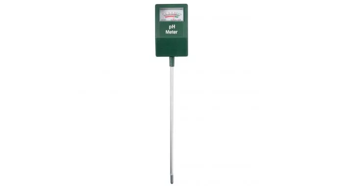 Uređaj za mjerenje pH vrijednosti tla, s mehaničkom skalom. Sondu treba zabosti u tlo do tri četvrtine, i otprilike jednu minutu kasnije prikazat će trenutnu vrijednost.