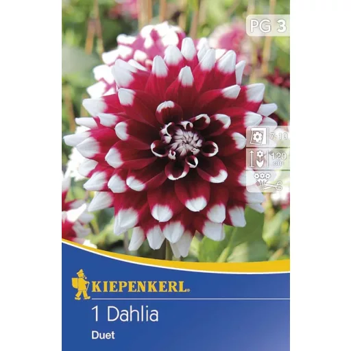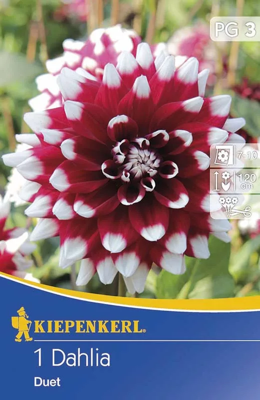 Dalija "Duet" jedna je od dvobojnih sorti. Ovaj gomolj tamnocrvene dekorativne dalije ima izražene bijele vrhove. Cvjetovi su visoki 15 do 20 cm. Visina biljaka 120 cm. Izvrstan izbor za gredice i kao dobro rezano cvijeće.