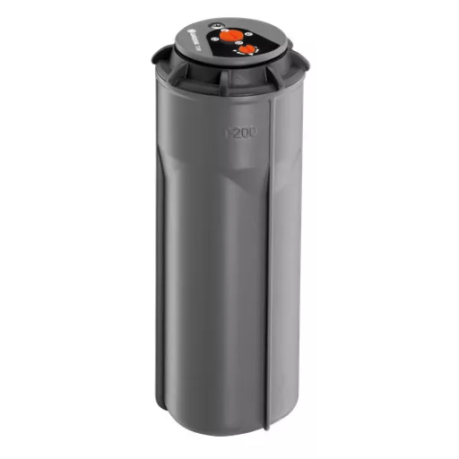GARDENA T 200 turbinska prskalica, dio GARDENA Sprinklersystema, idealna je za zalijevanje travnjaka srednje veličine do 200 m². T 200 turbinska prskalica može se kombinirati s T 100 i T 380 turbinskim prskalicama (artikli: 8201-29 i 8205-29) te s OS 140 ugradbenom četvrtastom prskalicom (artikl: 8220). Domet joj je podesiv između 5 i 8 m, ovisno o površini. Glava prskalice omogućuje bezstupanjsko - bez alata - podešavanje željenog sektora zalijevanja u rasponu 25-360°. Zalijevana površina može biti bilo koji dio od najmanjeg sektora do punog kruga. Zahvaljujući funkciji memorije, prskalica se automatski vraća na prethodno postavljeni sektor zalijevanja, čak i ako je glava prskalice namjerno okrenuta. Time uređaj uvijek zalijeva odgovarajuću površinu. Za fleksibilnost zalijevanja jednostavno je odabrati jednu od četiri mlaznice s različitim protocima vode prema pojedinačnom sektoru zalijevanja. To je posebno važno za ravnomjerno zalijevanje kada se koriste prskalice s različitim postavkama sektora. Ugrađeni filter omogućuje neprekidan rad. Pouzdani turbinski pogon otporan na pijesak osigurava dug vijek trajanja. Ako se u cjevovod ugradi ventil za ispuštanje vode (artikl: 2760-20), Sprinklersystem može postati otporan na smrzavanje. Priključak je s unutarnjim navojem promjera 1/2".