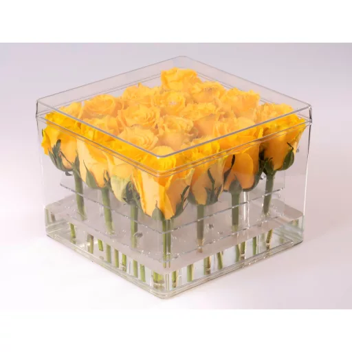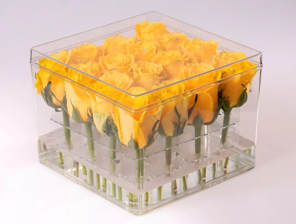 Ova svestrana, elegantna i praktična prozirna polistirenska kutija omiljeni je cvjetarski pribor današnjice. Njegova jedinstvenost leži u prozirnosti, koja omogućuje pogled u cijeli sadržaj kutije. Vanjska površina može se ukrasiti po želji (naljepnicama, trakama itd.), pa čak i brendirati vlastitim znakom!