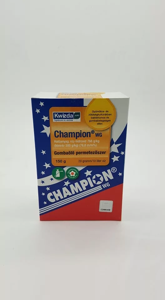 SPEKTAR DJELOVANJA Champion® WP je praktično učinkovit protiv svih fitopatogenih gljivica i bakterija, osim protiv pepelnice. U vinovoj lozi protiv peronospore i bacila; u jabuka protiv krastavosti, bakterijskog sušenja izbojaka; u krumpiru protiv plamenjače, alternarije i bakterijskih bolesti; u paprici, rajčici i krastavcu protiv bakterijskih i gljivičnih bolesti; u šećernoj repi protiv cercospore; u mahunarkama protiv bakterijskih i gljivičnih bolesti; u malini protiv bolesti izdanaka; u tvrdozrnom voću protiv bakterijskih i gljivičnih bolesti; u koštičavom voću protiv bakterijskog i gljivičnog sušenja izbojaka, perforacije lista, monilije, tafrine i gnomonijinih bolesti.