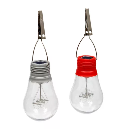 Solarni, plastični viseći lampioni s kopčom za pričvršćivanje. U obliku žarulje, izvrsni za ukrašavanje vrta i terase, stvaraju svečanu atmosferu. Spiralne LED-ice daju starinski i estetski izgled. 1,2 V 2/3 AAA mAh Ni-Mh punjiva baterija...