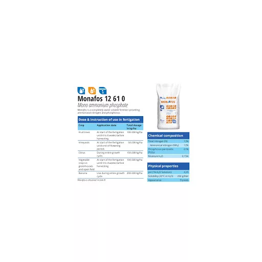 Monafos, MAP 12-61-0, monoamonijev fosfat, topiv u vodi, kristalni NP, EK gnojivo Proizvođač: Anorel Belgija, vreća 25 kg. Izvrsan izvor dušika i fosfora. 100 % topivo u vodi. Može se koristiti za prihranu putem hranjive otopine i za prihranu lišćem.