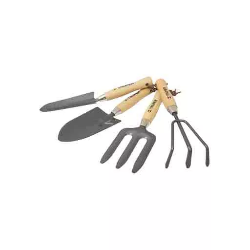 4-dijelni mini vrtni set. Mini lopatica, vilica, rahljač zemlje, uska sadilica. Duljina drške: 15 cm.