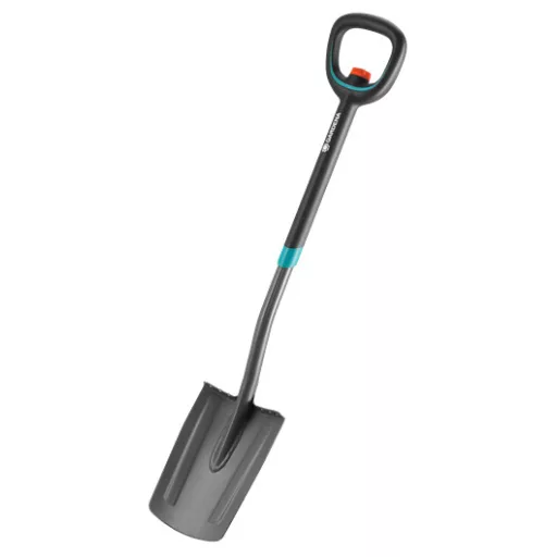 GARDENA ErgoLine teleskopska lopata izrazito je udoban alat za kopanje, pripremu tla, rastresanje i premještanje. Izuzetno široka i ergonomski oblikovana D-ručka omogućuje udobno držanje objema rukama i olakšava rad. Ovalni profil drške sprječava slučajno okretanje drške. Produženi plastični premaz bez prijelaza osigurava ugodno, protuklizno korištenje. Drška se može individualno podešavati na duljinu između 106 i 126 cm prema visini korisnika. Izuzetno oštar lopatični list izrađen je od kvalitetnog kaljenog čelika. Poseban profil izuzetno širokog naslona za nogu pruža čvrstu potporu pri kopanju i optimalan prijenos snage. Jamstvo iznosi 25 godina.