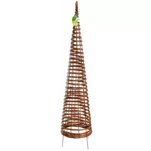 Piramidalni nosač za biljke obložen prirodnim prućem. Fino metalno pomagala za penjačice koja spaja metal i prirodni materijal. Može se postaviti u cvjetnjak ili u lonac za penjače, ali sama po sebi može biti savršen ukras vašeg vrta ili dvorišta.