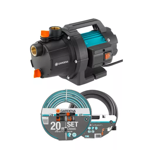 GARDENA vrtni set pumpi sadrži sve što je potrebno za brzo priključenje i puštanje u rad električne pumpe. Set sadrži Classic vrtna pumpa 3000/4, usisno crijevo GARDENA duljine 3,5 m i originalno GARDENA vrtno crijevo od 20 m s prskalicom i priključnim elementima. Kompaktna i robusna GARDENA vrtna pumpa 3000/4 dizajnirana je za razne zadatke pumpanja u vrtu. Možeš je koristiti za navodnjavanje, povećanje tlaka vode, pumpanje podzemne vode, vode iz vodovoda, kišnice, pa čak i klorirane vode iz bazena. Vrtna pumpa 3000/4 olakšava i čini vrtlarenje učinkovitijim. Ova lagana, izdržljiva i kompaktna električna pumpa jednostavna je za upotrebu, pruža veliku usisnu snagu pri vrlo visokom tlaku. Punjenje i praznjenje je jednostavno zahvaljujući dodatnom otvoru za punjenje i ispusnoj čepu. Tako možeš ispustiti preostalu vodu i zaštititi pumpu od mogućih oštećenja od smrzavanja. Zahvaljujući ergonomskom rukohvatu i maloj težini, pumpu je lako prenositi u vrtu. Štoviše, postavljena na tlo, pumpa stoji i radi sigurno na nogama. Ugrađeni glavni prekidač omogućuje jednostavnu upotrebu. Tijekom rada pumpu štiti termozaštitni prekidač koji zaustavlja pregrijani motor. GARDENA pumpe nisu pogodne za pumpanje slane vode, agresivnih ili lako zapaljivih tvari i hrane. Set vrtne pumpe 3000/4 izvrstan je izbor jer paket sadrži sve što ti može zatrebati. GARDENA je pouzdan svjetski lider s 40 godina iskustva u dizajnu i proizvodnji pumpi. Ovaj set pumpi vrijedi svoju cijenu ako tražiš uređaj za povremenu upotrebu.