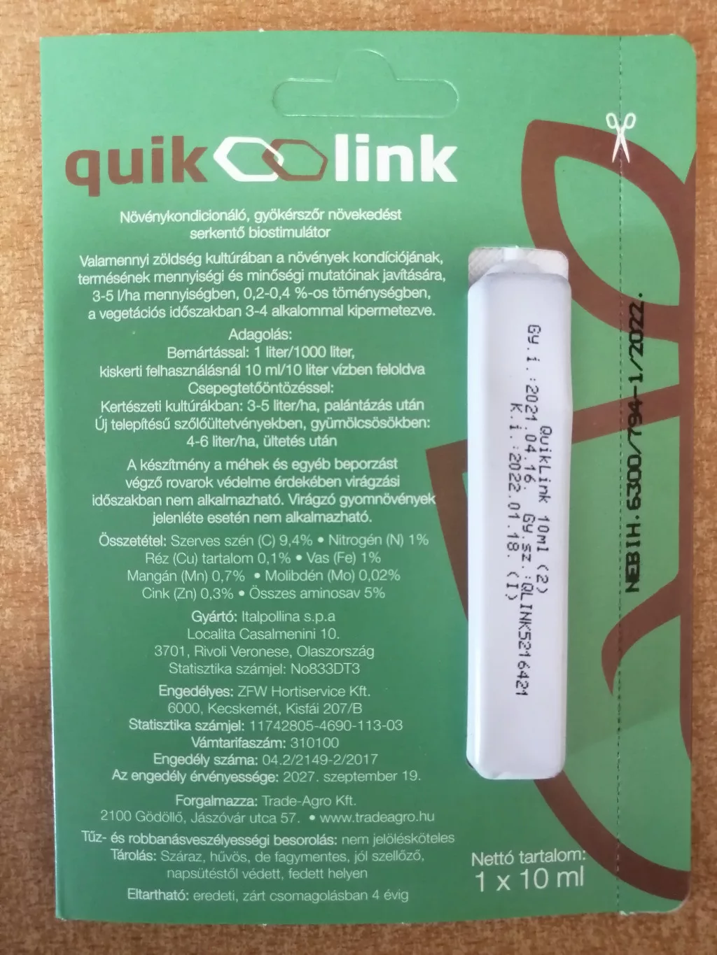 QUIKLINK je posebno organsko hranjivo, bogato aminokiselinama i peptidima, te s dodatnim mikroelementima (bakar, željezo, molibden, mangan i cink). Biološki aktivni sastojci (mikroelementi, aminokiseline i peptidi) potiču rast korijena i jačanje te zadebljanje korijenskih tkiva (lignifikacija). Molibden u njemu je od presudne važnosti za razvoj vegetativnih dijelova biljke. Povećava metabolizam, čime pomaže pri suzbijanju stresova iz okoliša i patogena. Izvrsno djeluje s mikoriznim gljivama. Može se koristiti za navodnjavanje kapanjem i kao folijarno gnojivo.