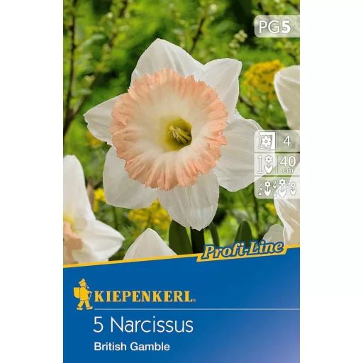 Značajke narcisa 'British Gamble': Može se rezati i kao rezano cvijeće. Preferira sunčano do polusjenovito mjesto, nakon sadnje zahtijeva temeljito zalijevanje. Dobro se razmnožava, nakon cvjetanja nije potrebno iskopavati. Visina: 40 cm. Cvjeta: u travnju.
