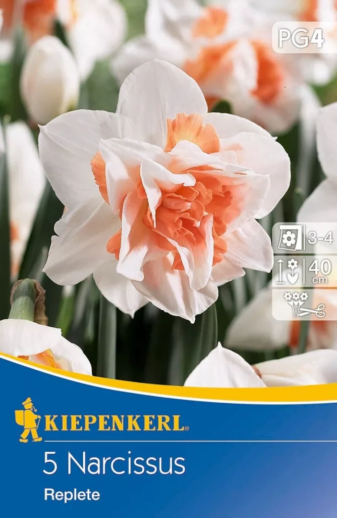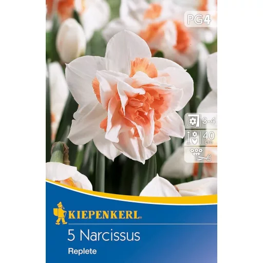 Značajke narcisa Replete: Voli sunčano do polusjenovito mjesto, nakon sadnje zahtijeva obilno zalijevanje. Dobro se razmnožava, nakon cvatnje nije potrebno vaditi lukovice. Visina: 40 cm. Cvjetanje: Cvjeta u ožujku i travnju.