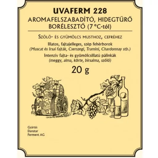 Uvaferm 228 je rezultat njemačkog istraživanja. Uz pomoć ovog kvasca naš destilat ili vino postaju znatno aromatičniji, bogatiji voćnim mirisima. Sojevi kvasca pomažu brzom, kontroliranom vrenju fermentacijske smjese; uz njih možemo očekivati puno bolji prinos. Hladno-otporan soj kvasca pozitivno utječe na senzorna svojstva i daje krajnjem proizvodu elegantan miris.