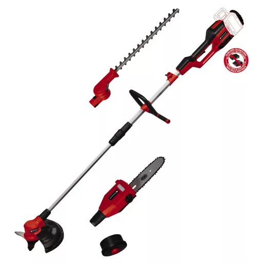 GE-LM 36/4in1 Li-Solo akumulatorski multifunkcionalni alat član je izuzetno svestrane obitelji proizvoda Einhell Power X-Change. Multifunkcionalni alat pokreće bezugljični (Einhell Brushless) elektromotor koji osigurava znatno dulji vijek trajanja uređaja nego tradicionalni motori s četkicama. Noževi jedinice za šišanje živice izrađeni su od visokokvalitetnog čelika rezanog laserom i brušenog dijamantom. Pila za uklanjanje grana multifunkcionalnog alata dizajnirana je s kvalitetnom OREGON šipkom i lancem. Produžna drška omogućuje jednostavno rezanje viših grana ili obrezivanje viših živica. Automatsko podmazivanje lanca tijekom rada osigurava spremnik za ulje za lanac. Jedinicu za šišanje živice možete naginjati u 7 različitih položaja, a konac se može automatski izvući pomoću tip-automatike. Fabrčko pakiranje sadrži visokokvalitetni trokraki nož i produžnu dršku. Podesiva pomoćna ručka i remen omogućuju izuzetno udobno korištenje. Uređaj se isporučuje bez akumulatora i punjača. Njih možete kupiti zasebno — na primjer u praktičnim početnim paketima.