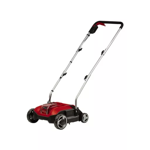 Einhell bežični GC-SC 18/28 Li-Solo baterijski provjetrivač tla nudi bežičnu slobodu u vašem vrtu. Moto „jedan za sve“ obitelji Power X-Change: baterije, punjači i alati u ovom sustavu mogu se fleksibilno međusobno kombinirati. Baterijski scarifier radi s bezčetkastim električnim motorom. Bubanj s noževima na kugličnim ležajevima s 12 rotirajuća noža radi snažno, ali nježno prema travnjaku. Podešavanje radne dubine u 3 stupnja sa transportnim položajem omogućuje udobnu uporabu. Vodilica je sklopiva i podesive visine, idealno prilagodljiva korisniku. Veliki kotači štite travnjak. Radna širina iznosi 280 mm. Zahvaljujući udarnom plastičnom kućištu, baterijski scarifier je vrlo otporan i izdržljiv. Baterijski uređaj je opcionalno moguće proširiti u 3-u-1 kombinirani alat s valjkom za provjetravanje i sakupljačkom vrećom. Ovisno o korištenoj bateriji, scarifier je preporučljiv za površine do 200 m². Za rad je potrebna 1 x 18 V baterija. U isporuci nisu uključeni baterija i punjač. Prodaju se zasebno, npr. kao praktičan početni komplet.