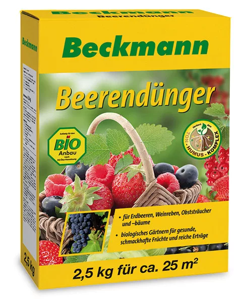 Dovoljno humusno, zdravo tlo i Beckmann organsko-mineralno gnojivo za jagode, grožđe i voće pomažu pravilnom rastu bobičastih biljaka i voćaka, grmova te stvaranju bogatog, ukusnog uroda. Sadrži sve važne glavne hranjive tvari i prirodno vezane mikroelemente.
