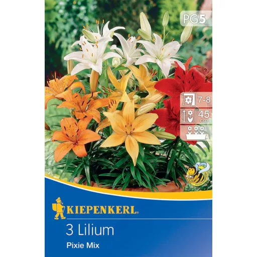Karakteristike mješavine ljiljana Virághagyma Liliom Pixie Mix Kiepenkerl: Promjer lukovice: 14/16 cm Preporučeno vrijeme sadnje: proljeće. Može se saditi i u balkonsku teglu. Očekivana visina biljke: 45 cm Vrijeme cvatnje: srpanj-kolovoz