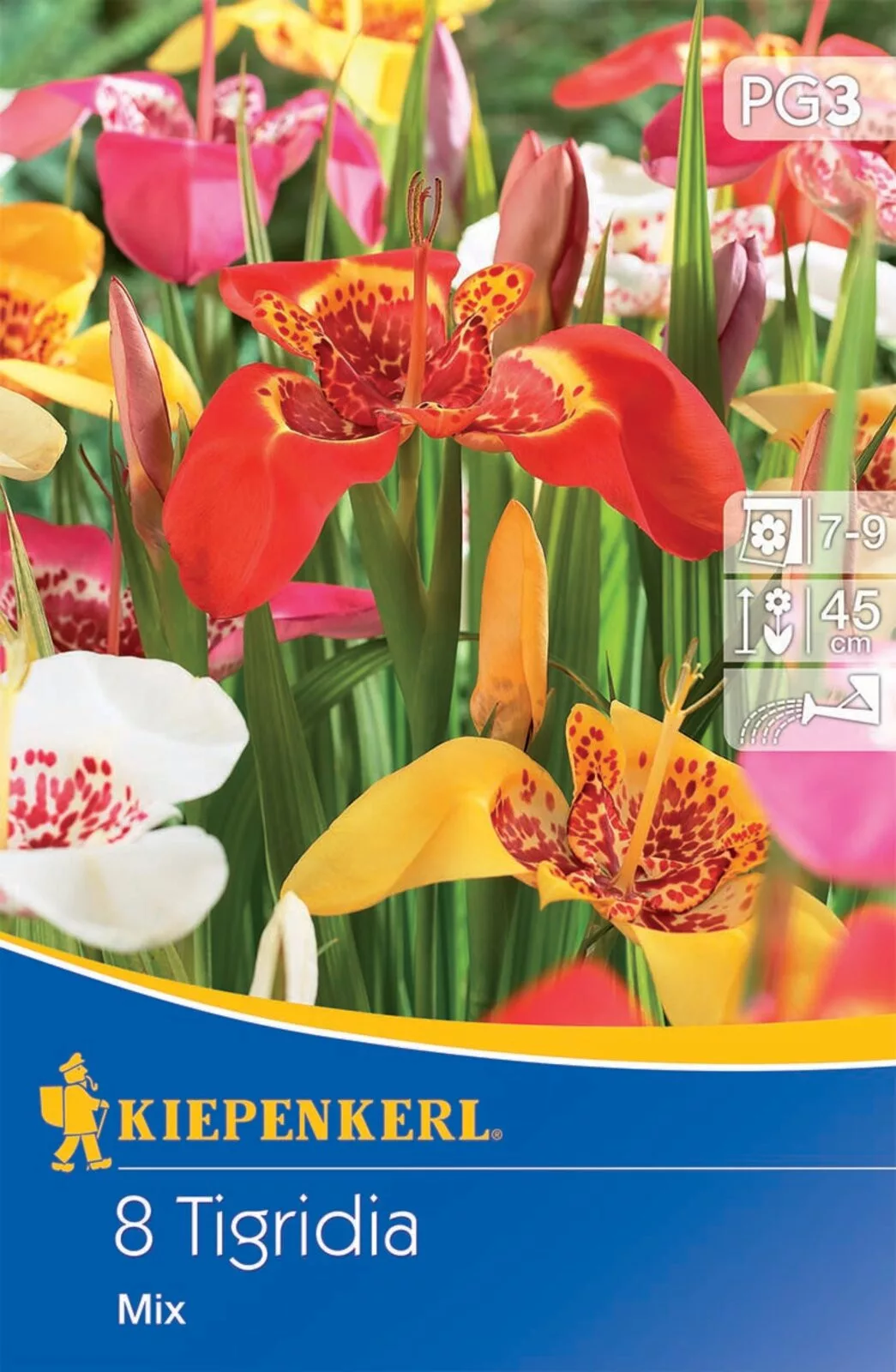 Cvjetna lukovica Tigridija mješavina boja Kiepenkerl 8 kom. opis: Veličina lukovice: 7/9 cm Preporučeno vrijeme sadnje: proljeće. Očekivana visina biljke: 45 cm Vrijeme cvatnje: srpanj–rujan