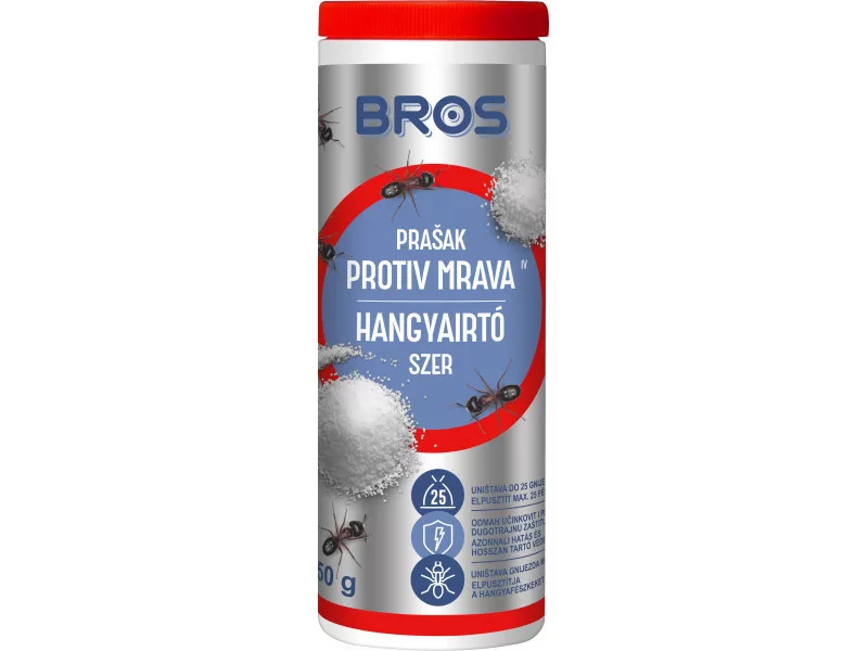 Bros prah protiv mrava 100 g posebno je pripravak namijenjen suzbijanju mrava koji se pojavljuju oko kuće, na terasama i drugim vanjskim površinama. Tekuće stanje praha omogućuje ciljanu primjenu na staze kojima mravi prolaze, na ulaze u gnijezda i u pukotine do kojih je teže doći drugim oblicima pripravaka. Proizvod, nanesen na mjesta aktivnosti mrava, pomaže u postupnom smanjenju broja u gnezdu.