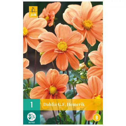 GF Hemerik jednocvjetna dalija zahvalan je ljetni cvijet koji pruža zadovoljstvo mjesecima. GF Hemerik cvjeta cijelo ljeto od srpnja do prvih mrazova. GF Hemerik raste otprilike 70 cm visoka. Stoga je ova dalija izvrsna i za sadnju u posudama na terasi ili balkonu.