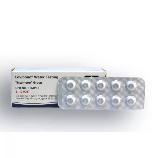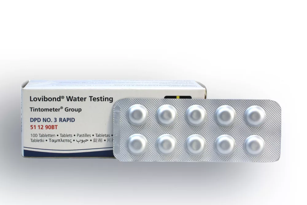 Uz klor/DPD1 tabletu dodajte 1 kom DPD3 tablete; obojenje pokazuje ukupnu količinu klora u vodi. Oduzimanjem izmjerene količine slobodnog aktivnog klora (DPD1 tableta) dobije se količina vezanog klora u vodi, izražena u mg/l.