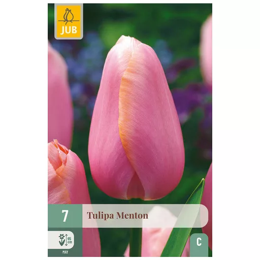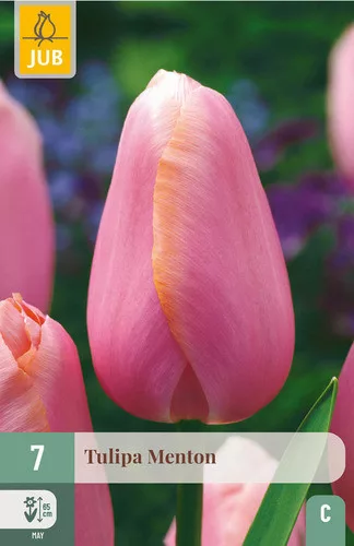 Upadljivi lososno-ružičasti tulipan Menton ljepota je svakog proljetnog vrta. Lijepo se kombinira s drugim tulipanima, na primjer s tulipanom Clearwater. Upadljiv je vrtni tulipan, ali odgovara i u posudi na terasi ili balkonu.